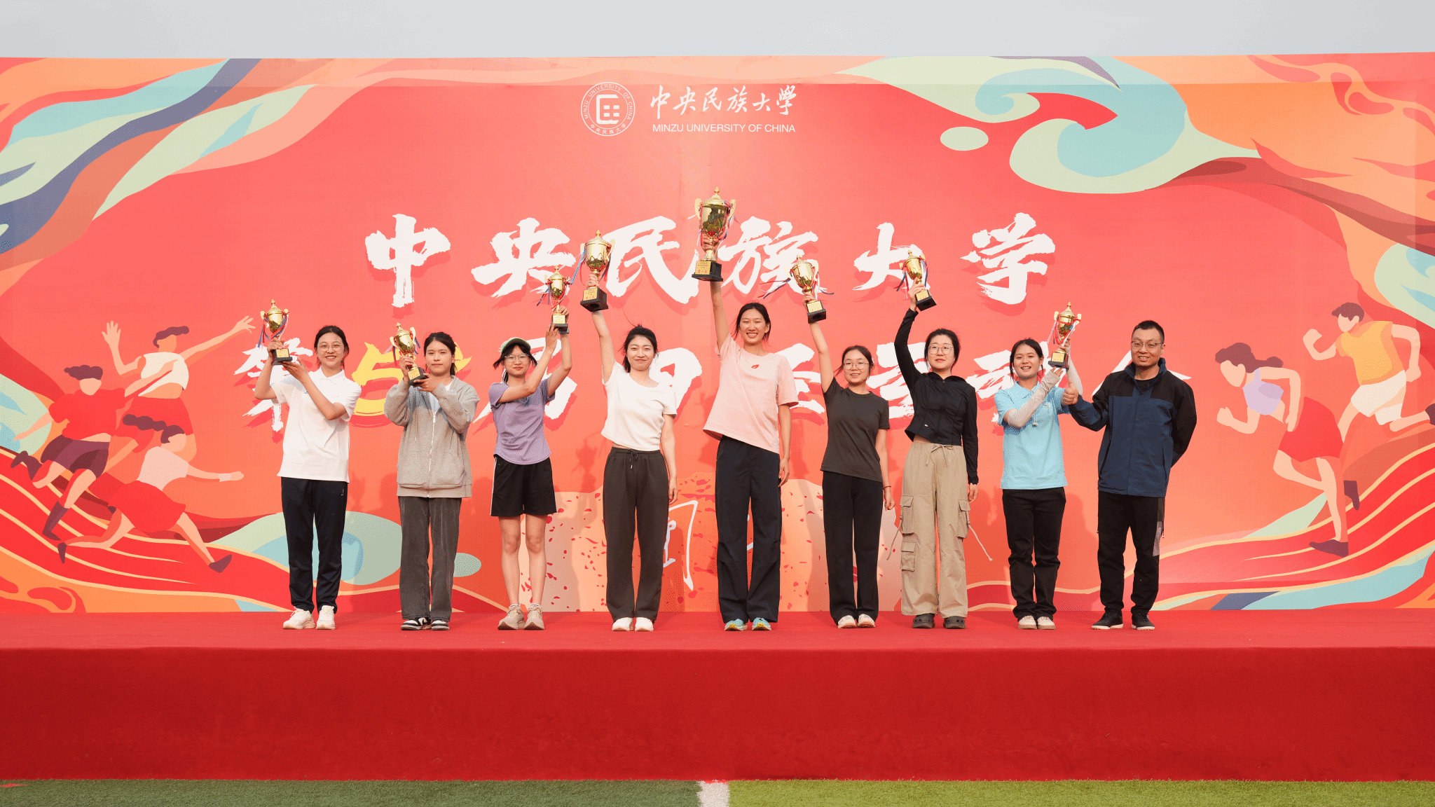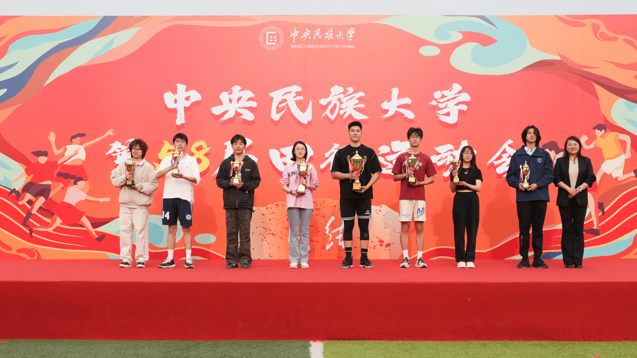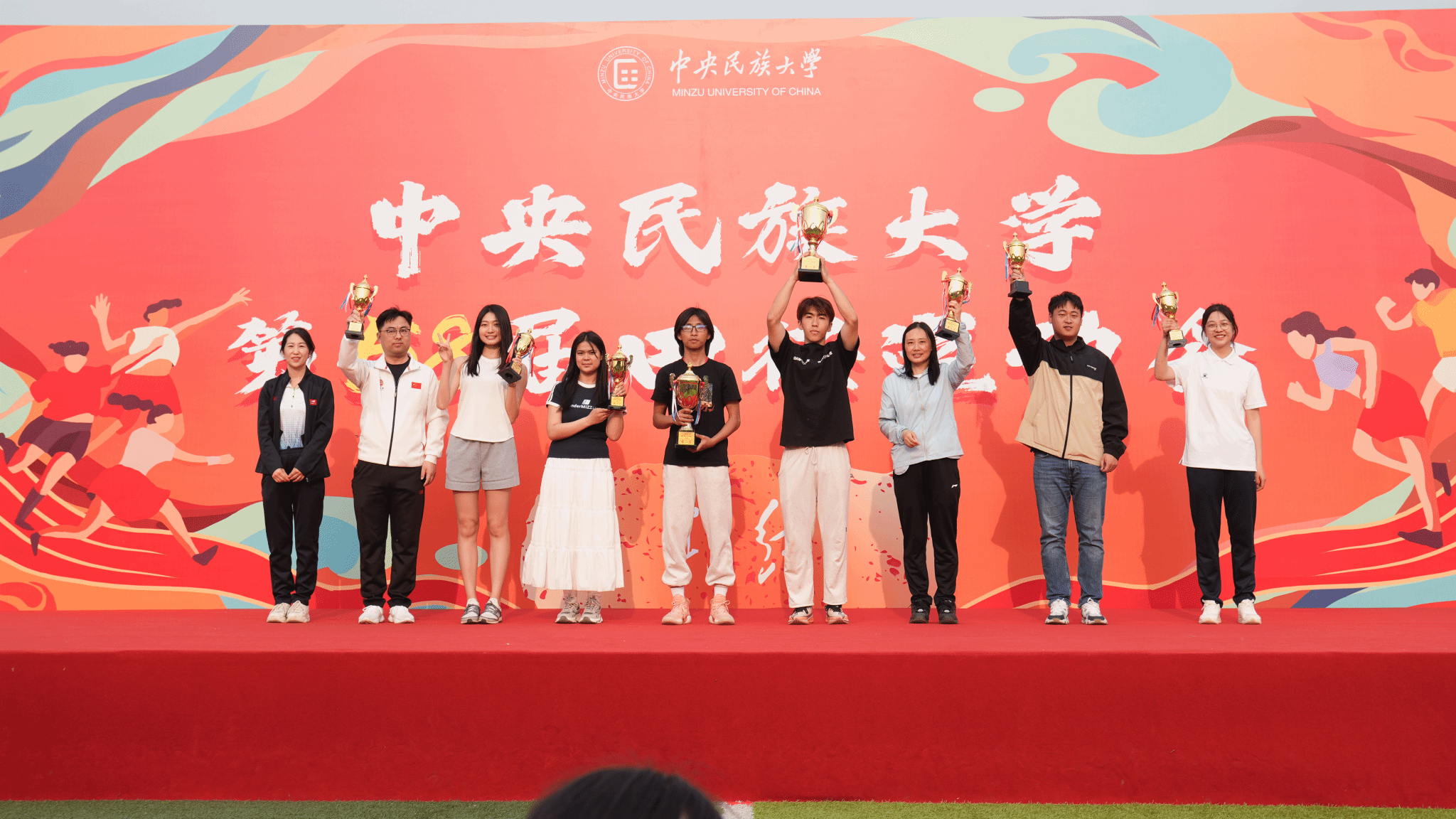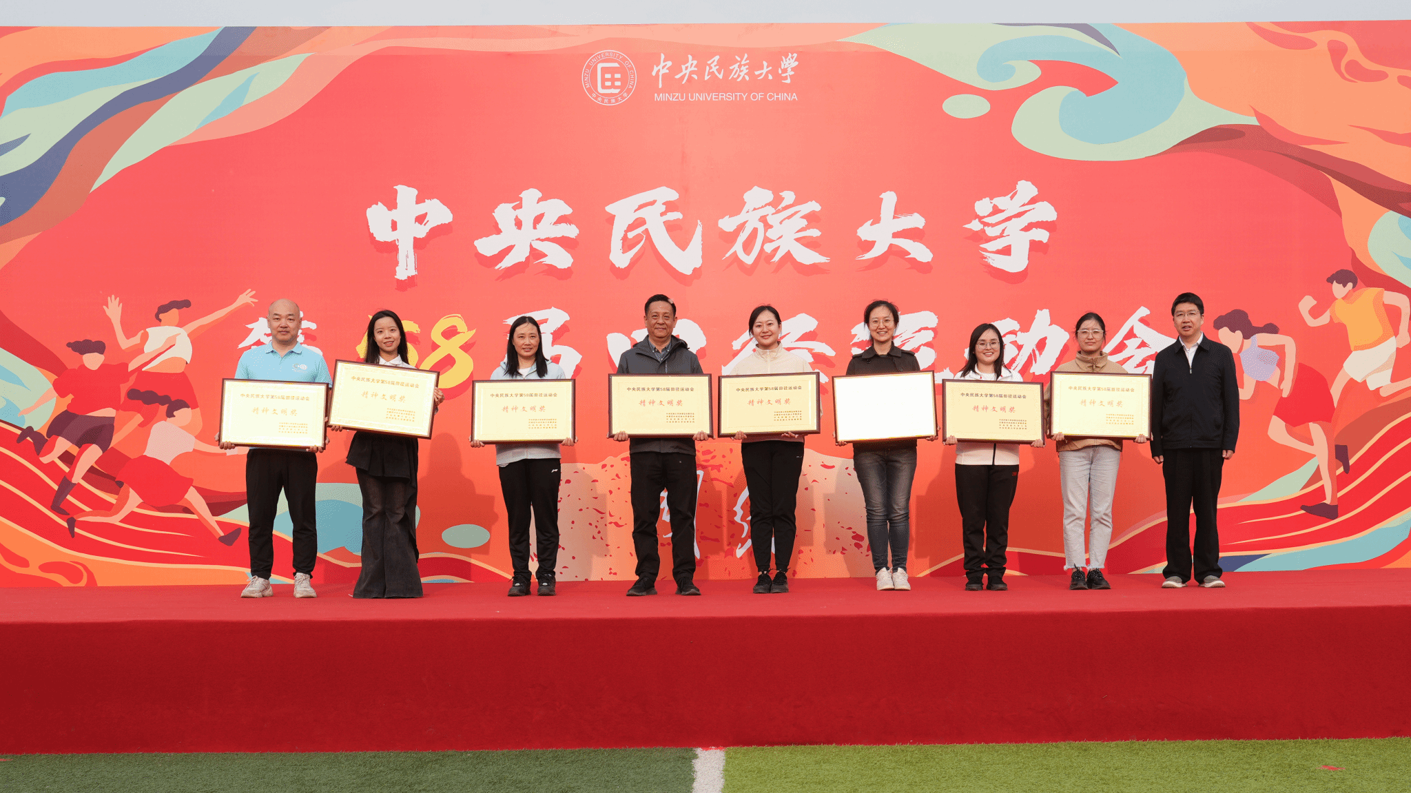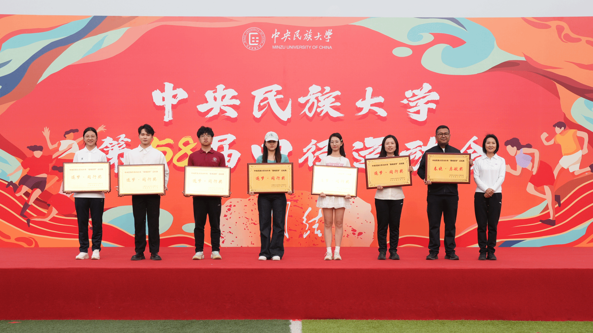 閉幕式上,楊慕云和豐臺區王佐鎮黨委副書記孫崢為獲獎學院頒獎。本屆運動會中,生命與環境科學學院、理學院、經濟學院等獲得男子學生組團體總分前八名,生命與環境科學學院、經濟學院、中國少數民族語言文學學院等獲得女子學生組團體總分前八名,生命與環境科學學院、經濟學院、理學院等獲得男女子學生組團體總分前八名。中國少數民族語言文學學院、經濟學院、管理學院等獲得精神文明獎。體育學院獲得最佳貢獻獎。閉幕式現場還宣布了今年3月舉辦的中央民族大學2025年“春曉逐夢”啟航跑評比結果,最終,體育學院獲“春曉?啟航獎”,理學院、經濟學院、教育學院等獲“逐夢?同行獎”。