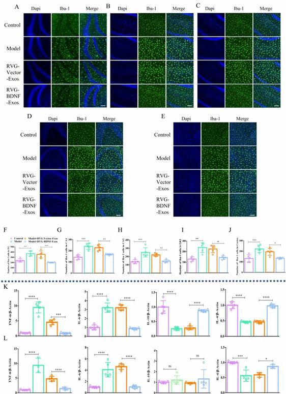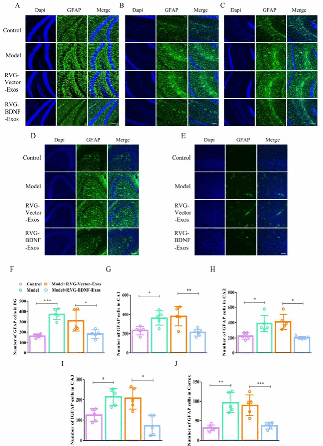 進一步研究發現,RVG-BDNF-Exos不僅能夠減少抑郁樣行為小鼠腦部的小膠質細胞數量,緩解神經炎癥,還顯著降低了星形膠質細胞的數量,這些結果進一步表明其對抑郁癥有顯著的治療潛力(圖4-5)。