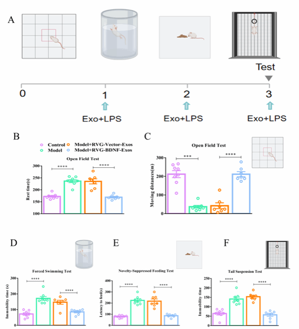 在一系列行為學測試中,接受RVG-BDNF-Exos治療的小鼠表現出顯著的抑郁癥狀改善。例如,在曠場測試中,小鼠的靜止時間顯著減少;在強迫游泳測試和尾懸測試中,小鼠的靜止時間也顯著縮短;在新奇食物抑制測試中,小鼠在新環境中的進食潛伏期明顯縮短。這些結果表明RVG-BDNF-Exos能夠顯著改善抑郁樣行為(圖3)。
