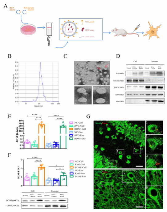 程勇教授課題組通過基因工程技術開發出一種能夠高效遞送BDNF基因的靶向外泌體。具體來說,他們將神經元特異性的狂犬病毒糖蛋白(RVG)和BDNF基因結合,并導入到293T細胞中。這些細胞隨后生產出含有BDNF基因的工程化外泌體(RVG-BDNF-Exos),能夠特異性地靶向神經元。