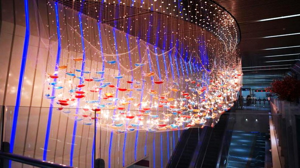 花莊站是換乘車站,該站的公共藝術核心主題是“大運河文化”。美術學院創作團隊在瓷板上繪就了表現通州地區清代漕運盛世繁景的古畫《潞河督運圖》(原畫:清?江萱繪):運河上漕艘挽運,千帆爭渡,沿河兩岸則是民宅店鋪與寺廟官衙櫛比相鄰。透過古畫,人們仿佛穿越到過去,感受到運河流淌的陣陣波濤以及繁忙的漕運景致。作品力圖通過表現京杭大運河的盛世繁景,講述花莊站的背后的歷史故事,豐富人們的視覺感受。