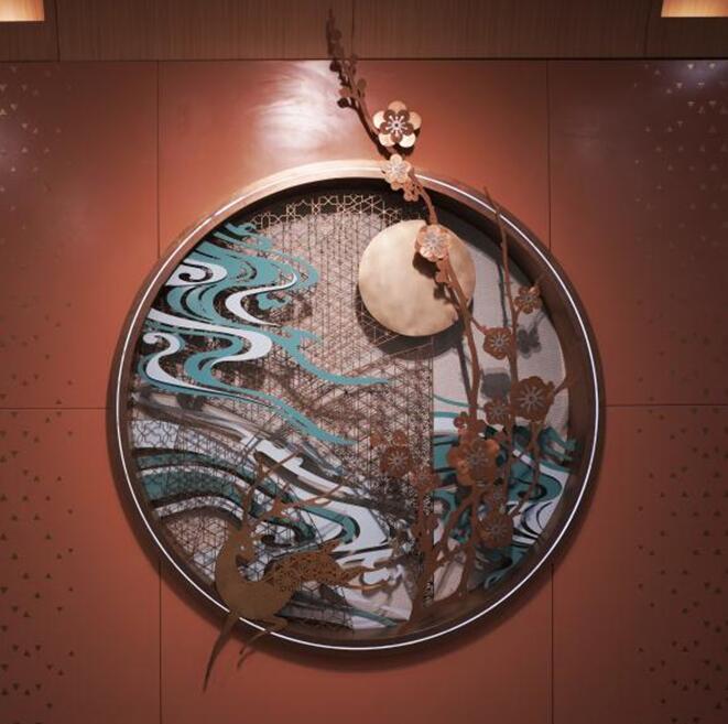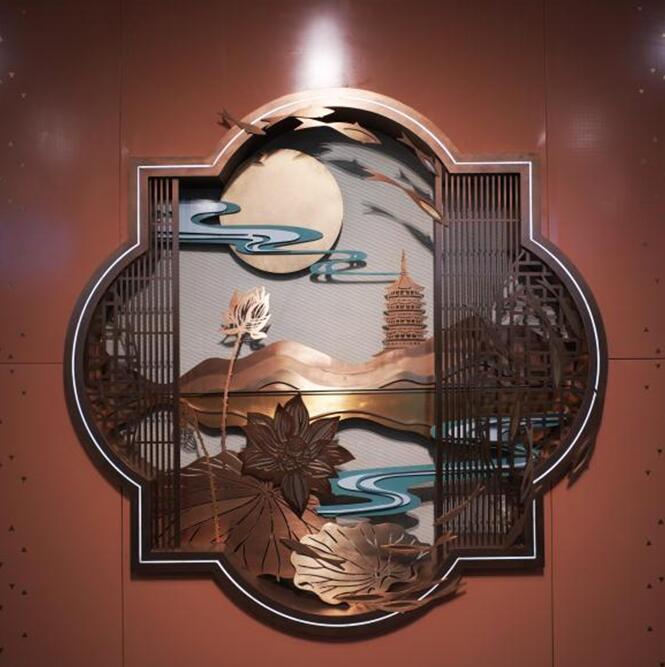 高樓金站的核心主題是“德韻清風”,作品以“梅蘭竹菊松荷 ”六君子為主題進行獨立創作,設計風格與線路整體裝修概念“窗韻”契合,也與該站廳六處藝術品墻體相匹配。作品于窗中以小見大,借用六種自古以來富于文人精神的風雅植物,象征“清廉潔白”的高尚節操,以此寓意中華君子風骨在當代的傳承與延續。