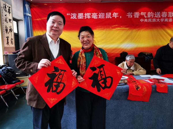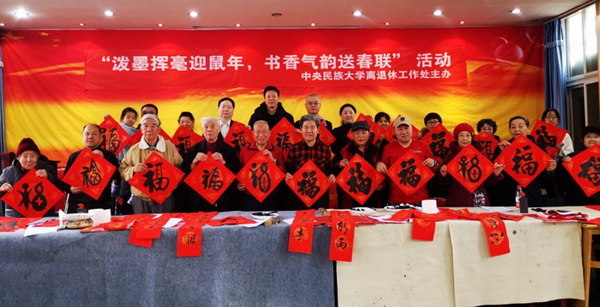 新聞網訊 在鼠年新春佳節來臨之際,為弘揚中華傳統民俗文化,營造安定、祥和、歡樂的節日氣氛,1月16日上午,我校離退休工作處在中央民族大學離退休教職工活動中心,舉辦主題為“潑墨揮毫迎鼠年,書香氣韻送春聯”為我校離退休老同志寫春聯送祝福活動。校黨委常務副書記馬文喜,離退休教職工黨委書記包永全,離退休工作處處長王華軍、副處長劉珂欣、朱濤來到活動現場,與老同志一起共迎新春佳節。