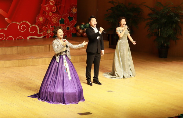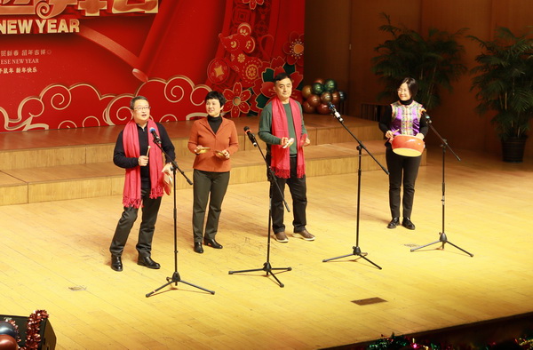 團拜會上,由教職員工表演的合唱《我的祖國》《我們走在大路上》《母親是中華》,獨唱《中國人》《節日歡歌》唱出了民大人對黨、對祖國的深切情意,唱出了民大人喜迎新春,笑望明天的美好憧憬;民族舞蹈《繡荷包》《幸福路上》、民族服飾表演展現了我校多民族各美其美、美美與共的民族融合文化盛景;三句半《喜事兒多》幽默風趣,用精辟精悍的語言和接地氣的表演,總結回顧了全年的大事喜事……節目精彩紛呈,中國少數民族語言文學學院四位教師在表演唱《祖國的春天》節目中,即興邀請了場下觀眾上臺共舞,把團拜會喜慶的氣氛帶向高潮。