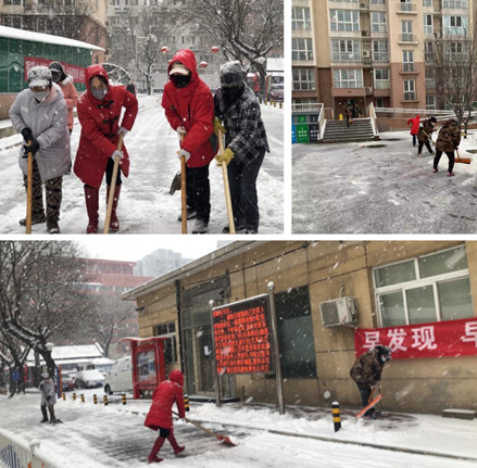 民大社區防控疫情仍在繼續,帝都瑞雪帶來陣陣寒意,路面被積雪覆蓋,這樣一群人,手持鏟雪鍬、大掃帚一步一步鏟除積雪薄冰,清掃出一條居民安心回家路。防控崗有一線的“戰士”,家門口有義不容辭守護社區環境的人。溫暖再次襲來!